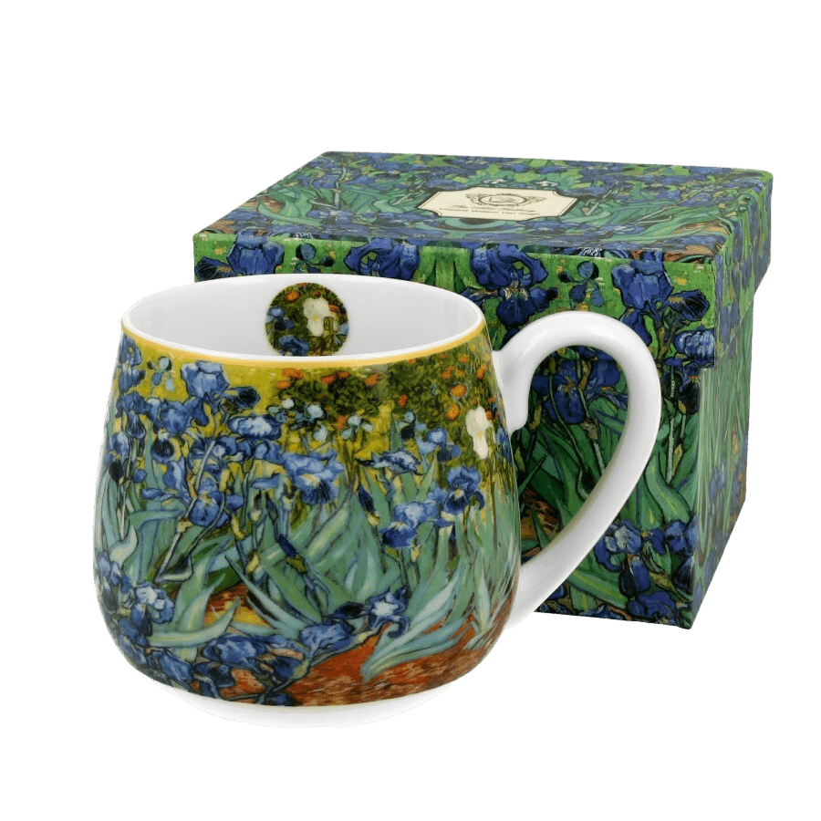 Taza de porcelana de 430 ml., en caja de regalo. El cuadro “Irises” de 1889 de Vincent van Gogh fue creado durante la estancia del artista en un hospital psiquiátrico. El patrón de la pintura también es un reflejo de la fascinación de Van Gogh por el arte japonés. Actualmente, la pintura se encuentra en la colección del Museo J. Paul Getty de Los Ángeles. La combinación armoniosa de varios tonos de azul con un verde exuberante refleja perfectamente la paz de la imagen y la belleza y el encanto de las flores de iris. Todo ello empaquetado en una caja decorativa decorada con el mismo motivo, es una gran idea para un original regalo de cumpleaños tanto para hombres como para mujeres, así como un regalo para el jefe/a o el profesor/a, también como agradecimiento.