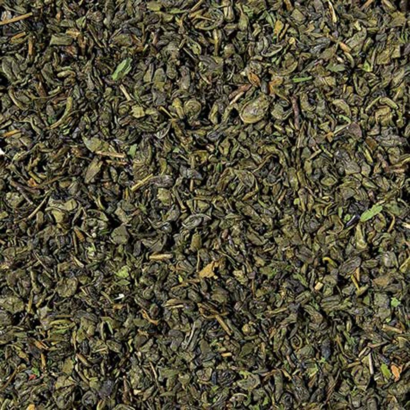 Té verde Gunpowder de hoja enrollada, enriquecido con hojas de menta moruna, muy popular en países del norte de África.